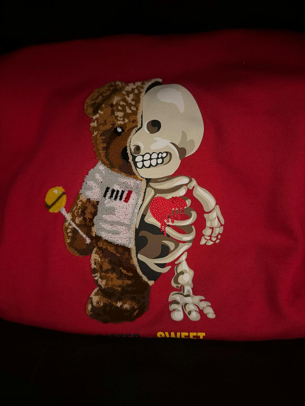 Toothbrush + texture printed bonding patch & rhinestone technique, total bear and skull graphic looks very delicate, stereoscopic, unique, novelty and hipster